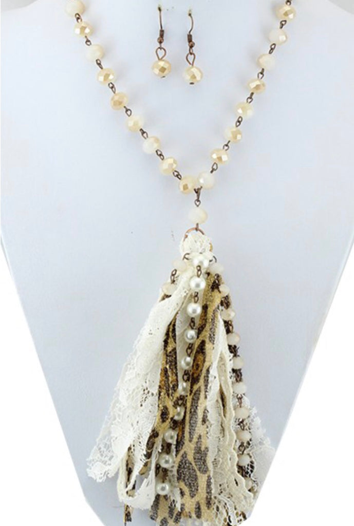 Fabric and pearl tassel necklace on crystal beaded chain with matching earrings