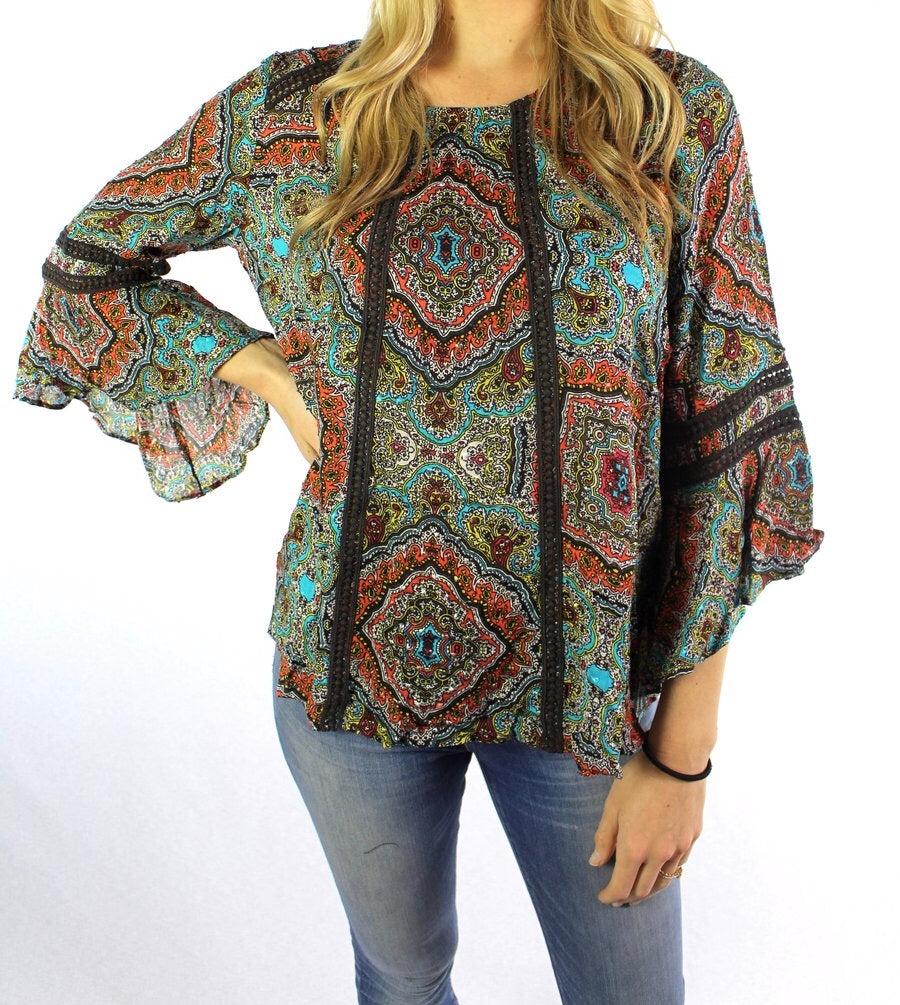 Floral peasant top with 3/4 bell sleeve and round neck